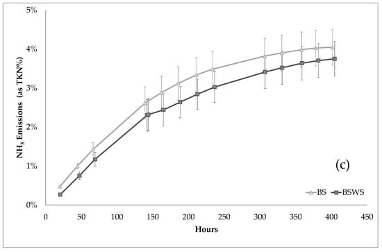 Cumulative NH3 emissions from buffalo raw slurry with straw (BSWS) in comparison with buffalo raw slurry (BS) emissions without any cover expressed as g NH3 m−2 h−1(a), as TAN% (b), and as TKN% (c). Error bars indicate SEM (n = 3).