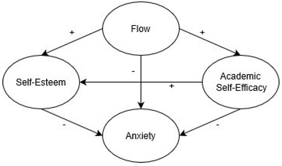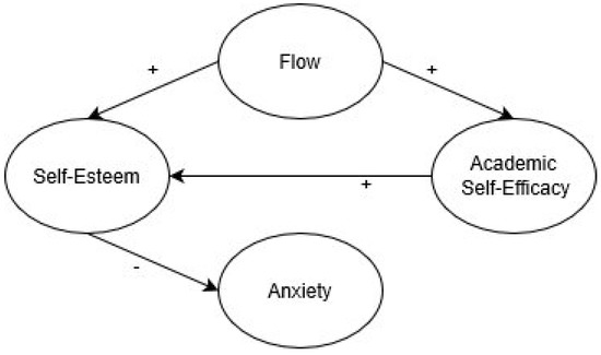 In addition, according to broaden-and-build theory [51], a subset of positive emotions (i.e., joy, interest, contentment, and love) have different functions. For instance, joy sparks the urge to play and interest sparks the urge to explore, which in turn build the individual's personal resources; these may range from physical and intellectual resources to social and psychological resources. Importantly, these resources function as reserves that can be drawn upon later to assist in coping with negative situations and emotions [51]. From this point of view, the impact of flow on anxiety may function through this broaden-and-build process. Individual self-efficacy, which is rebuilt in this process and then improves self-esteem, may act as a personal resource to alleviate anxiety. Thus, the following hypotheses were proposed: