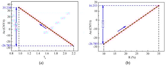 In order to find the sort orders of each parameter’s influence degree, we conduct a sensitivity analysis using τg, R, r, Fg, and pg as independent variables and Ae as the dependent variable. From the value ranges of these independent variables shown in Table 5, we set their base values at their median values, 1.58, 22.5%, 60 CNY/t, 15 CNY/t, and 0.08 m2/t, respectively, with the variation coefficients of the independent variables set at ±5%, ±10%, ±15%, and ±20%, respectively.