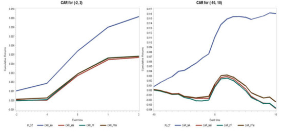 40], as in Equation (9). In this study, we focus on the post-merger CAR and BHAR because the acquirer was independent of the target at the announcement date. The deal is effective only after the deal closes or is consummated. To estimate the expected returns, we use the constant mean-adjusted model for all subsequent regressions after confirming that our results do not substantially differ across the different measurement approaches outlined above. We run a panel regression using a squared term of time until completion to test the inverse U-shaped relationship between stock performance and time until deal completion: