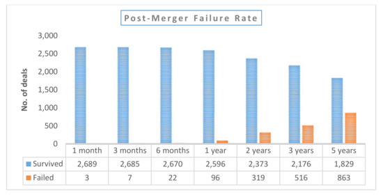 Figure 5. As the figure shows, there is a substantial rate of failure for acquirers post-M&A in our sample. About one-third of firms fail within five years after the deal. Some studies find post-M&A failure rates of about 70% or 90% [