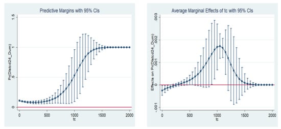 Figure 6 conform to the shape of a logit distribution and reveal low and decreasing levels of failure prediction before the turning point, and a sharp increase in failure prediction in the days beyond the optimum, which worsens every day. Moreover, the marginal effect is negative before the turning point, indicating that, before the turning point, each additional day reduces the likelihood of failure (supporting the due diligence hypothesis), but that, after the turning point, the marginal effect is always above zero, though it rises sharply and falls. However, the fact that it remains positive beyond the turning point shows that each additional day beyond the turning point is associated with an increased likelihood of failure, supporting the overdue hypothesis.