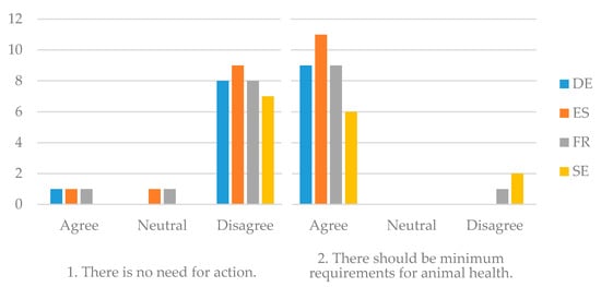 Unsurprisingly, there was a high level of agreement in support of introducing minimum requirements with regard to health outcomes, i.e., 92.1% agreed with the statement (mean rank 4.3) that “There should be minimum requirements for animal health” (Figure 1, statement 2). However, there was disagreement over whether there should be legal provisions to enforce these requirements, or whether the requirements should be applied and monitored by private sector organisations. Swedish and German stakeholders generally favoured the former approach, while French and Spanish stakeholders supported the latter.