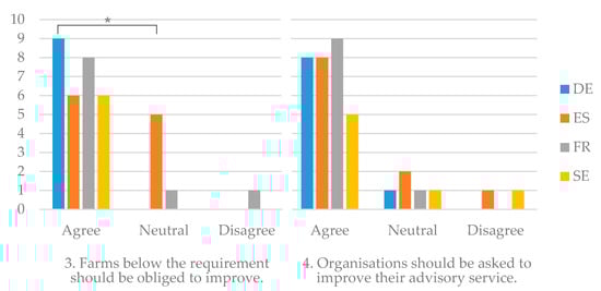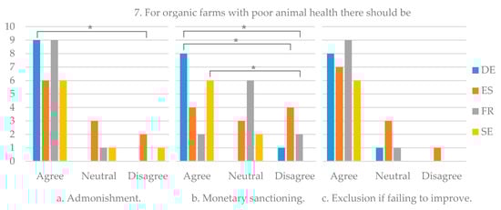 Spanish and German stakeholders differed significantly in terms of their agreement with the general obligation to improve for farms failing to meet a certain animal health requirement (Figure 2, statement 3, p = 0.026) and with the prospect of admonishment for poorly performing farms (Figure 5, statement 7a, p = 0.0275). More country-based differences were found in the level of agreement with the use of financial sanctions, with substantially more agreement among the German and Swedish stakeholders than the Spanish and French (Figure 5, statement 7b, p-values < 0.05). This is likely to be due to the cultural differences mentioned earlier, where Germany and Sweden have a long history of national animal welfare regulations with associated sanctions, in contrast to Spain, whose animal welfare legislation mainly exists because of demands from the European Union [45].