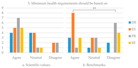 Stakeholder votes on statements 5a and 5b presented during consultations in Germany (DE), Spain (ES), France (FR), and Sweden (SE). Asterisks (** p < 0.01) indicate statistically significant differences between groups.