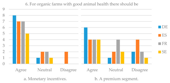 Although the concept of animal welfare is much broader than the concept of animal health, two alternative policy mechanisms, i.e., state influence (government regulation) and market influence (initiatives of the market to differentiate animal products), apply equally to both [35]. Stakeholder attitudes to market influence were revealed in their agreement with the statement: “For organic farms with good animal health there should be a premium segment” (Figure 4, statement 6b). Fifty percent (mean rank 3.3) agreed, with only 25% disagreeing with this statement. However, within the agreement group, there was considerable critical debate over possible dangers, as the following quotes illustrate: