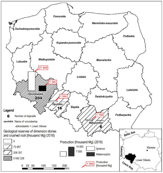 Reserves and production of igneous and metamorphic dimension stones and crushed rocks in Lower Silesia and other regions of Poland, based on PGI data [11].