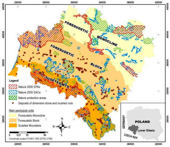 Location of dimension stones and crushed rock deposits, main geological units, and nature protection areas in Lower Silesia. SPA denotes special protection area, SAC denotes special areas of conservation.
