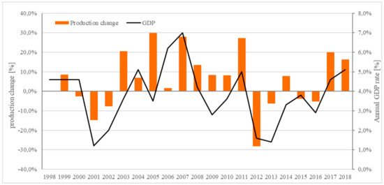 As it was mentioned earlier, Lower Silesian igneous and metamorphic dimension stones and crushed rocks account for over 90% of the total production in Poland. The actual share for particular lithological groups of these rock raw materials is given in Table 4. The share ranged from 75.9% for melaphyre and porphyry group to 100% for amphibolite, migmatite, and serpentinite groups. On the other hand, production of sedimentary DSCR in Lower Silesia accounted for just 1% to 2% of national supply. This shows that in terms of igneous and metamorphic rock raw materials, the Lower Silesian resources are critical for the national economy, as well as the fact that consumers have to and are willing to pay the costs of transport to locations that are at a greater distance from the source region. This dependence on regional sources is also visible in the time series of annual production (Figure 3 and Figure 4). For the purpose of this study, annual production levels were traced from as early as 1998, and were plotted together with annual change of national gross domestic product (GDP) [52]. The calculated Pearson correlation coefficient that measures the statistical relationship between two continuous variables, that is, annual GDP change and annual change of DSCR production, was equal r = 0.645, which indicates a strong, positive relationship. These results are further discussed later in this paper.