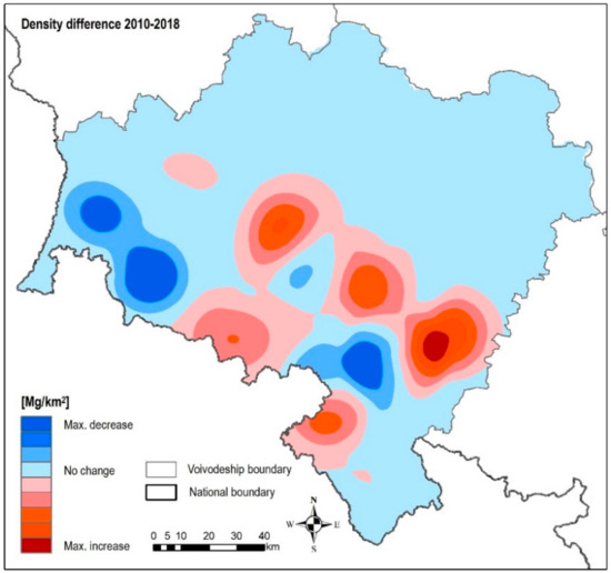 The input parameters include spatial location (x and y coordinates), population field value, and the search radius [54]. The locations are quarries and the population field are their output (Mg). The search radius for the size of Lower Silesia was set, as in the previous study [8], to 20,000 m. The function calculates surface that represents volume of production per unit area (Mg/km sq). The pixel size of output raster was set to 100 x 100 m [12]. Production density maps for 2010 and 2018 were used to calculate production density difference with raster calculator function.