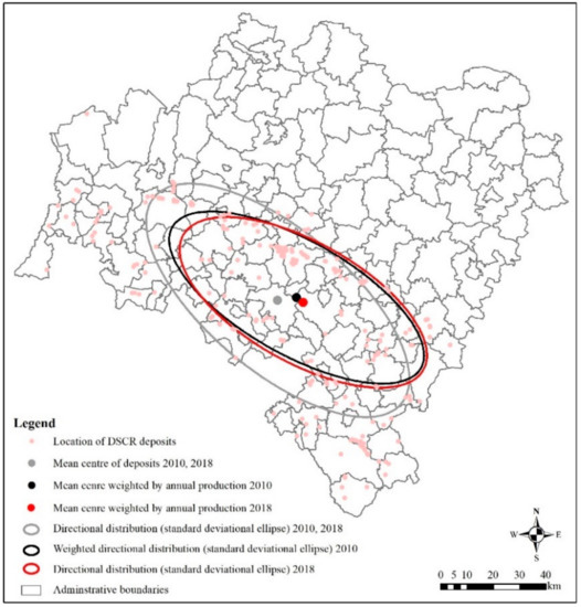 GIS spatial statistics were used for analysis of spatial distribution of DSCR production in Lower Silesia and its change in time allowed for identification of areas of the most intensive DSCR quarrying. The map of difference of DSCR production density per unit area between 2010 and 2018 calculated with Kernel density function (Figure 5) indicated areas of intensified DSCR quarrying (red colors) and areas of quarrying decrease (blue colors). The most intensive quarrying has taken place in the central and south-east parts of the region, whereas peripherally, in relation to Poland, parts of the region experienced decline in production. This was determined partly by geology and the location of exploitable deposits (Figure 2), but the distance to demand areas could have also influenced this trend. This observation is substantiated by results of spatial statistics calculations, that is, mean center and standard deviational ellipse statistics (Figure 6). The mean center of quarry locations weighted by their annual output (2010; black dot) was shifted east in comparison to the unweighted mean center of their locations (gray dot) by approximately 9900 m, whereas the weighted mean center location of quarries calculated for their 2018 output (red dot) was shifted further 2500 m eastwards.