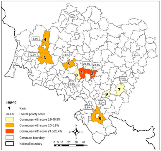 Each of the communes in the Lower Silesia region was assigned a value with respect to each of the six criteria considered. The values were allocated using a 1 to 6 point scale, where 6 meant the most favorable conditions and 1 the least favorable circumstances. When a given factor was not present in a commune, such as for undeveloped DSCR deposits or no deposits being available due to environmental constraints, a score of 0 was assigned and the commune was excluded from further analysis. There were 29 communes with undeveloped DSCR deposits of national or regional importance identified in the analysis. When these were considered further, we found that 22 of these communes had at least 1 documented DSCR deposit whose exploitation was not constrained by environmental protections requirements. The spatial congruence of deposit and nature protection areas (environmental conflict) was investigated with GIS map overlay analysis. Overall, nine communes meet all of the criteria and were investigated in full. First, weighted scores for the nine communes in each of the criteria were calculated, then weights of local preferences with respect to these criteria were determined, in accordance with the AHP methodology described earlier. The weights of local preferences with respect to criteria for these communes are presented in Table 7, and results of overall priority calculations (ranking) are given in Table 8 and in Figure 7. The consistency ratios (CR) for pairwise comparisons for alternatives with respect to criteria varied from 0.8% to 7.1% and were within the required limits (≤ 10%). The lowest value (0.8%) was obtained for the undeveloped DSCR deposit criterion, and the highest (7.1%) was for the railroad/DSCR loading point infrastructure criterion.