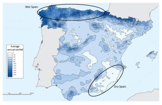 Spain offers an ideal study setting due to its severe hydric imbalance between short- and long-term water supply and demand [58]. Water resources in Spain are highly non-uniformly distributed, with remarkable differences between the north-Atlantic area (‘wet Spain’) and the south-eastern area (‘dry Spain’) (Figure 1). The north-Atlantic area has an average annual rainfall of 1,800 mm, whereas the average annual rainfall in Spain is 636 mm. In contrast, in south-eastern Spain, average annual rainfall is 290 mm. This part of Spain therefore lies in the top quartile of the world’s driest countries [59].