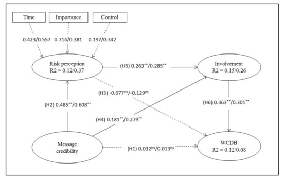 Figure 2 depicts β path coefficients and R2 values for the dependent variables for each sample, finding that our model performs similarly for both samples. Accordingly, perceived message credibility and risk perception have no significant influence on WCDB in either of the two samples (H1 and H3 rejected), while personal involvement has the greatest influence on WCDB (H6 supported). Similarly, the influence of perceived message credibility on the risk perception has the strongest influence in the model for both water contexts (H2 supported). The two precursory variables of personal involvement are significant, risk perception being the variable with the greatest influence (H4 and H5 supported). Moreover, all the coefficients of the analysed relationships are positive, which is consistent with our theoretical framework.