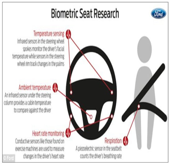 Figure 6 shows the technology developed by Ford to detect and prevent drowsy driving. Ford has applied the following techniques to prevent drowsy driving [13]. Ford’s system uses an infrared sensor on the handlebar, a heart-rate sensor, and a breathing sensor on the seat belt to collect biometric information. Then, after analyzing the steering wheel and pedals, the driver’s fatigue is calculated to support an alarm sound. Ford’s vehicles have a temperature sensor and heart rate detection. However, the accuracy of drowsy driving detection is not high with these features alone.