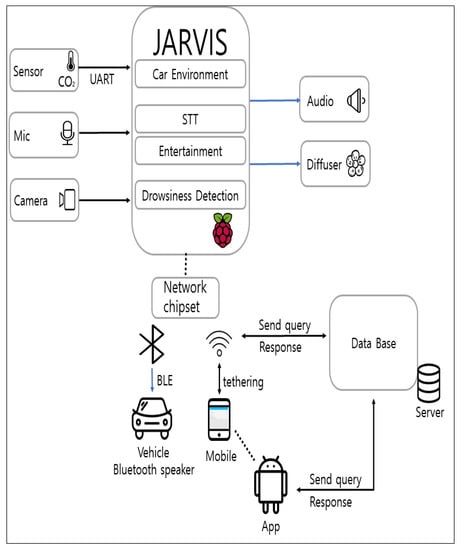 Figure 10 represents the system configuration diagram. The following items summarize the system configuration diagram: The project name of this system is JARVIS. Carbon dioxide sensor chips and camera images are used to detect drowsiness in the vehicle. The camera detects face recognition and blinking and automatically turns on music and broadcasting when drowsiness is detected. The driver can request a broadcast or desired music through the microphone. Because cameras and sensors are built into the diffuser, they are not spatially and visually constrained. To take a break, the driver can use a mobile to guide them to nearby rest areas, and this information is provided in the database.