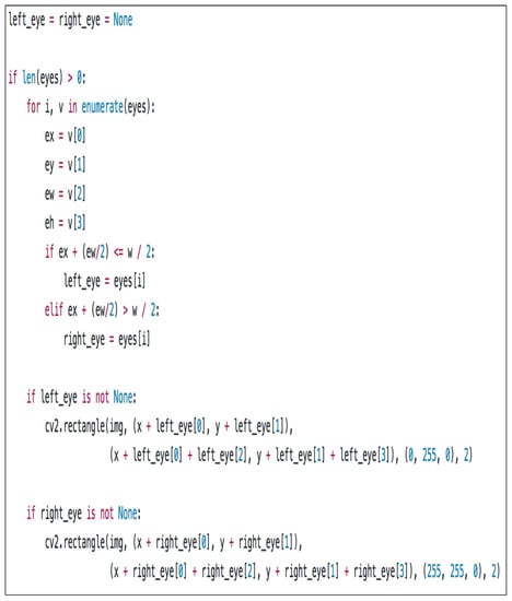 Figure 11 indicates some of the actual developed sources. There were many cases of incorrect detection, such as eyebrows, hair, etc. Therefore, this study implemented this source for reducing incorrect detection by exactly recognizing the left eye and right eye when both eyes are located in each facial position according to the center of the face.