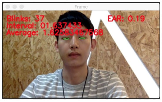 Figure 13 shows a scene that detects blinking. The results from the Raspberry Pi for carbon dioxide detection alone made it difficult to detect drowsy driving. Therefore, it was possible to improve the prevention of drowsy driving by improving the algorithm for image processing as much as possible and efficiently detecting eye blinking using deep learning [17].