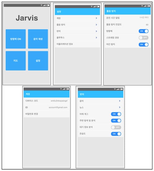 Figure 15 shows the various functions of the drowsy driving prevention system. In the default settings, you can configure settings for the account, drowsy driving detection, convenience functions, and Bluetooth. The drowsy driving detection includes built-in driving-time alerts, drowsiness sensitivity figures, air fresheners, stretching recommendations, and nighttime teaming. The driving-time reminder can check fatigue levels by displaying the driving time every hour. The drowsiness sensitivity figures automatically play music when the number exceeds 60 and guide you to the nearest rest area. Nevertheless, if drowsiness is detected, stretching is recommended in the announcement. In the convenience function, various functions, such as music, current news, and humor, are provided according to the drowsy driving detection value, and the temperature and humidity in the vehicle are checked and provided periodically.