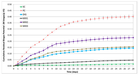 Mean cumulative RBP28 test curves expressed in Nlbiogas/g VS for 28 days of experimental time. Error bars represent the standard deviations.
