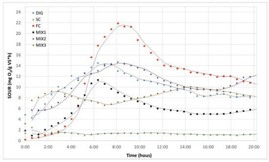 SOUR test trends expressed in mg O2/g VS*h for 20 h of experimental time.