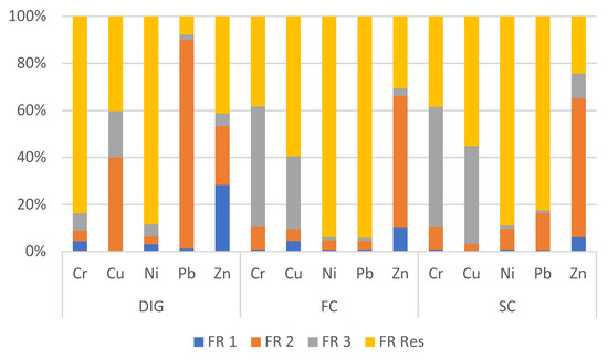 Figure 3. Heavy metal fractionation (%). Percentage distributions of the different chemical fractions of heavy metals in the starting materials (DIG, FC and SC).