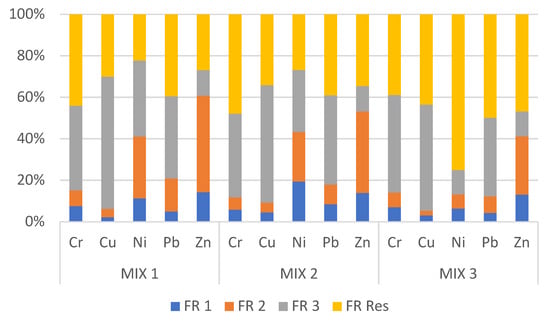Figure 4. Heavy metal fractionation (%). Percentage distributions of the different chemical fractions of heavy metals in the digestate-based mixtures (MIX1, MIX2 and MIX3).
