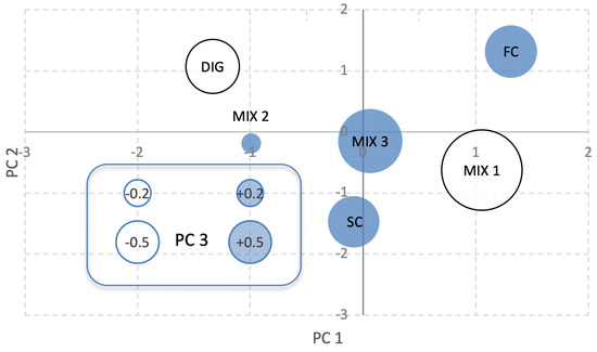 The bubble-plot of scores provided a graphical representation of the starting materials and of the mixtures, pinpointing the variables that appear to be more associated with each sample (Figure 5). As expected, the starting materials were discriminated in the plot. While DIG resulted associated with parameters that highlighted its biological instability, SC presented a high level of biological stability, being located at different extremes of PC2. FC revealed its high degree of instability (PC2) and it is also associated with enzymatic activity linked to the C cycle (PC1). However, FC and SC were also correlated with indicators of the lack of toxicity (Heavy metals—Residual Fraction; positive values on PC3), while DIG resulted associated to the bioavailable fractions of heavy metals (Heavy metals—Fraction 2; negative values on PC3). All the mixtures were located in the center of the plot, enlightening their intermediate level of biological stability (intermediate values of OD20, BMP28 and Butyrate esterase; positive values on PC2); however, the different values on PC3 revealed a lower level of toxicity of MIX3 to MIX1 and MIX2, reflecting the germination test and the heavy metal fractionation results.