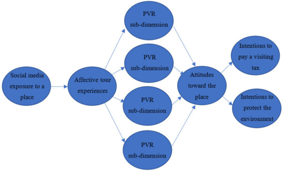 The main purpose of this study, therefore, is to corroborate the theoretical as well as practical utility of PVR in a structural equation model. As potential antecedents of PVR, this study focuses on exposure to place information via social network sites (SNS) and affective tour experiences. Certainly, tourists must visit a specific place in order to develop emotional bonding and PVR. Further, one of the driving forces for tourists to have curiosity and desire to visit a certain place in recent years is tourism information shared, diffused, and consumed through social media platforms [10]. As a sequential process, this study hypothesizes that social media exposure to place information significantly leads to affective tour experiences, and affective tour experiences, in turn, are associated with PVR. It is asserted in this study that PVR as a relational outcome between visitors and a tourism place should result from affective tour experiences facilitated by social media use for tourism information. This study also suggests that PVR as a determinant should influence tourists’ attitudes toward a place and their behavioral intentions for countermeasures against overtourism. By demonstrating such relationships between PVR, attitudes, and behavioral intentions, this study aims to highlight the roles and functions of PVR that can help enhance tourists’ voluntarily eco-friendly behaviors in line with the core philosophy of sustainable tourism. In addition, with a series of factor analyses, the construct validity of PVR and its structural components are identified.