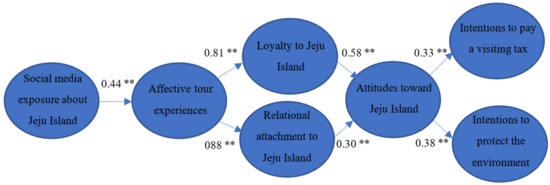 Descriptive statistics indicated that the mean score of social media information exposure regarding Jeju Island was 4.62 (SD = 1.33). The mean score of affective tour experiences was 5.64 (SD = 0.84). On the other hand, the mean score of attitudes toward Jeju Isalnd was 5.47 (SD = 1.08). The mean score of behavioral intentions to pay a visiting tax was 3.82 (SD = 1.52), whereas that of behavioral intentions to behave in an environmentally friendly manner was 5.21 (SD = 1.29).