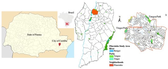 From that basin, the Pilarzinho neighborhood was chosen based on three main criteria; (i) it borders the Barigui river, (ii) it has one of lowest sewage coverage areas, and (iii) it has the highest population density. It makes border with two parks in Curitiba—Tangua Park and Tingui Park—and these are used as a flood attenuation, as shown in Figure 2.