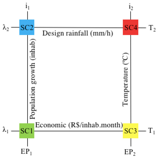 For the scenario building, external factors were defined as (i) the per year population growth rate (λ); (ii) the annual average temperature (T), which helps with previewing the contribution of the human activities to global warming and the behavior of population according to the temperature variation, as [34] highlighted as a variable of climate change effects; (iii) the economic performance (EP), which reflects directly on the social conditions where the community is inserted; and (iv) the rainfall intensity, also highlighted by [34], being the rainfall divided in maximal rainfall intensity to evaluate flow peaks and the average rainfall intensity to evaluate the pollutants loads.