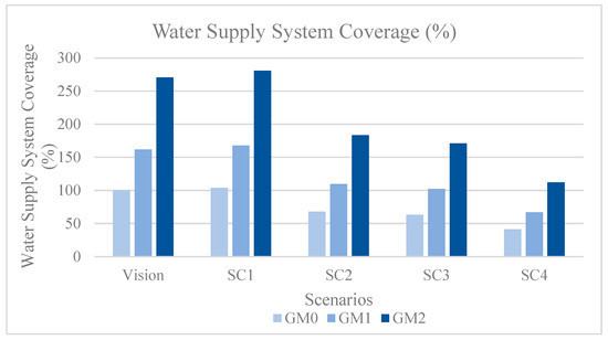 Water supply system coverage outcomes according to GM0, GM1, and GM2 in SC1, SC2, SC3, and SC4.