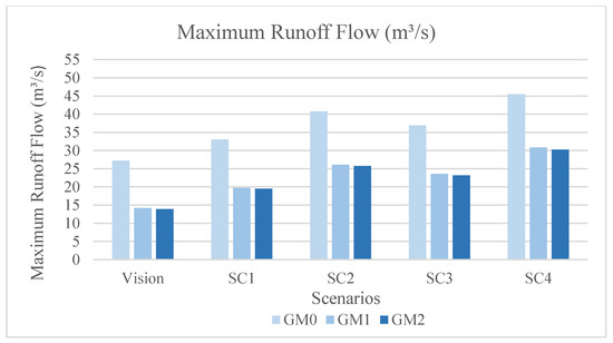 Maximal runoff flow outcomes according to GM0, GM1, and GM2 in SC1, SC2, SC3, and SC4.