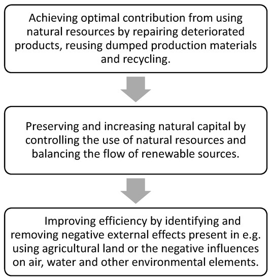 A circular economy ensures multiple mechanisms of generating new value that are separate from the exploitation of limited natural resources. A circular economy can be defined in different ways. Here are some of the most cited definitions of a circular economy. “The centre of a circular economy is the circular (closed) flow of raw materials and energy consumption in multiple phases” [7]. Another definition is that it is “an economy based on a spiral loop, i.e., a system that minimizes matter, energy flow and environmental deterioration without limiting economic growth or social and technical advancement” [8]. The Ellen MacArthur Foundation [9] presents a circular economy as “a regenerative industrial economy by design or purposes.” Webster [10] states that “the purpose of a circular economy is to create products, components and materials with the highest service value over time.“ “Waste is food” is among the leading principles of circular economies, enabling all expended materials or products, as well as those nearing or at the end of their life cycles to be used once again as input for manufacturing the next generation of products [11,12].