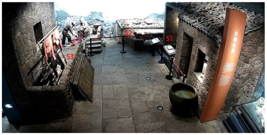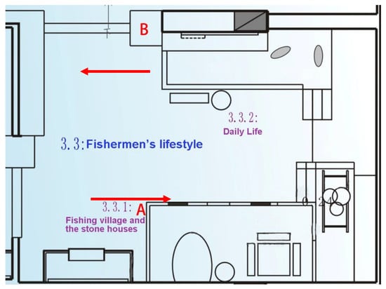 Points S1, S2 and S3 were selected as the observation points, namely, the attention points attracting the visitors to remain for a while. S1 mainly introduced the food of the fishing village and reproduced the food on the table in the houses, with text labels and touch screen. S2 was set in a large seashore painting, with seabirds chirping, reproducing the daily life of fishermen, including drying net, fish and the unique fish odor. S3 showed the fishermen’s clothing, including statues of two fishermen and the effect of sea breezes.