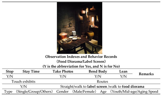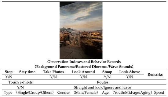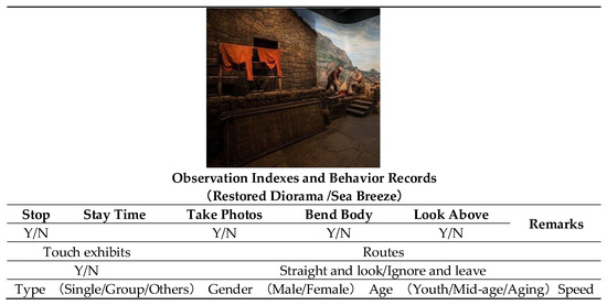 In the visitor fixed-point observation grids, each point was designed separately. Each group was provided with a card with the grid and the total number at each point was counted according to the numbers of cards after the survey. The observed visitors were randomly selected. The sample size was 893 groups of visitors totaling 2152 individuals. The ‘Remarks’ column of the observation grid was used to record the observed visitors’ bending and touching at exhibits, the intentional changes in viewing angles, obvious acceleration/deceleration and talks, among other data. ‘Route’ was filled with descriptive records that appropriately reflected the general route in the observation area. ‘Speed’ was measured in ‘m2/min,’ calculated against the time the observed visitor remained in the predefined area, which was used to reflect the influence of a specific sense on a visitor’s behavior.