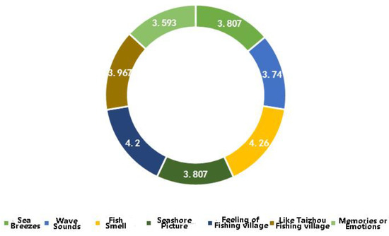 Q8–14 focused on the visceral experience through the tactile, auditory, olfactory and visual senses; the evaluation criterion was whether these senses could be acquired. By our findings, the average score of Q8–14 was 3.91. Aside from three items—the olfactory sense, the feeling of the fishing village and whether it was similar to a Taizhou fishing village—the remaining items were lower than the average score (Figure 8). This reflects the visitors’ relatively low degree of identification with other senses, except for the smell and sight. It was also clear that the influence and effect of other senses on one’s visiting experience were relatively weak. Through the correlation analysis, age and whether the visitors had been to a fishing village showed a significant correlation with the scores of Q8–14.