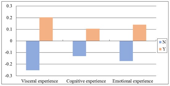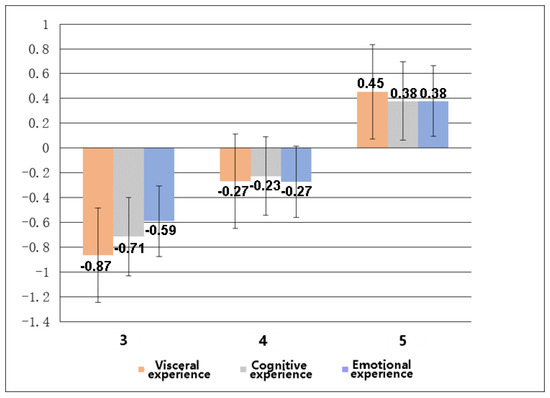 The scores of the overall experience in Q7 were all from 3 to 5. In other words, no visitor rated 1 or 2. Among the visitors who rated 3, 4 and 5, a statistical significance and a certain tendency was seen in Q8–14 (visceral experience, p = 0.000), Q15–16 (cognitive experience, p = 0.000) and Q17–18 (emotional experience, p = 0.000). Visitors who scored low in these three aspects of questions also did so in overall experience rate, that is, they rated 3 or 4 which was below the average. Visceral experience was the most effective in reflecting the differences between visitors who rated different scores. This finding indicates that the polarization of visceral experience exerted a direct influence on one’s overall experience (Figure 10).