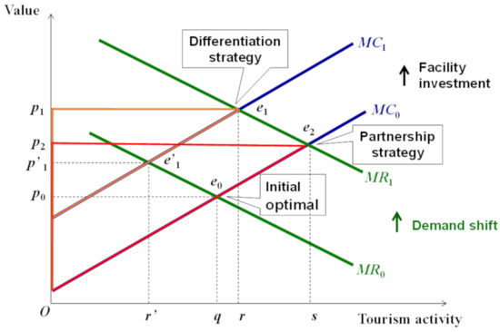 Now, the authors consider the partnership strategy, which is comprised of two perspectives: one seeks the operator’s individual benefit, and the other seeks community benefit. Let us explain in the figure: The partnership strategy is generally based on the social capital in the community, rather than facility differentiation. In this case, it is supposed that the investment cost for each operator, such as an event or destination marketing organized by the local community, is much smaller than that of a differentiation strategy. To simplify the discussion here, no investment cost is assumed for this strategy, which means no upward shift of the MC line. Under this circumstance, the optimal point of this strategy is achieved at e2 (where MR1 meets MC0), as the collaborative action creates an increased demand for accommodation, demonstrated by the shift from MR0 to MR1. Consequently, the operator’s surplus, P2e2j, will be larger than that of the former competitive differentiation strategy and also that of the initial point. From this consideration, we can say that the partnership strategy will be less costly in facility investment than the differentiation strategy. Put differently, the operator will have a larger surplus than in the case of the differentiation strategy if the investment cost is identical. However, it should be said that this strategy is only possible in a community where well-functioned social capital which nurtures community-based activities has been established. Otherwise, significant upward shifts of MC will occur for the establishment of social capital, which requires long-term endeavours for the people concerned in the community.