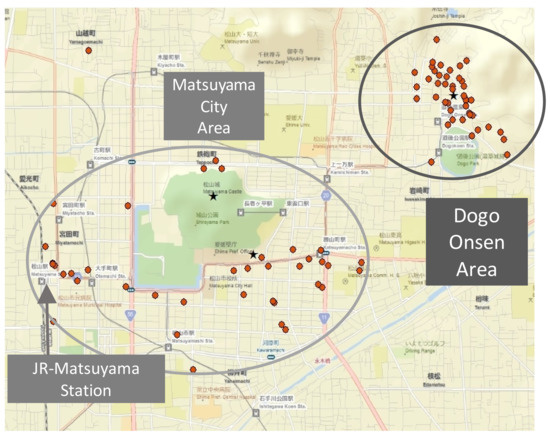 We focused on accommodation facilities within a 3 km radius around Matsuyama Castle, the symbol of local identity and a major tourist attraction in addition to Dogo Onsen. While 88 accommodation facilities were located in the study area, data were available from only 77 facilities. This study area included Dogo Onsen, the JR railway station, and a shopping area, which meant that this area was where most of the economic activities were undertaken. Names and addresses of facilities were collected from the “i town page” and the Internet telephone directory. More detailed information, such as prices and number and types of rooms, was obtained from the Internet hotel and ryokan booking site in Japan (i.e., an online travel agency) named “Jalan net”. If data were not available from this site, the authors directly contacted the facilities by telephone to obtain this information. As the authors studied the prices of accommodation facilities, we could collect that data directly from the website of the individual facility. Many facilities, however, did not have a web booking system that enabled them to reflect price changes on the site instantly. For this reason, the authors used price data from Jalan net, which reflected price changes immediately. Data collection was carried out during the first ten days of October 2015, except for the weekend (when prices go up). During this period, the authors also conducted an interview with an official of the local tourism association to obtain an overview of trends in tourism in this area. Spatial distances between accommodation facilities were measured using the ArcGIS software.