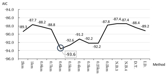 Figure 5 indicates that the spatial weight matrix that is defined as closeness within a 600 m range had the lowest AIC; therefore, this weight matrix is most appropriate for the empirical model. It takes about ten minutes to walk a distance of 600 m. This result is similar to results of a study on pricing behaviour of Airbnb accommodation ([