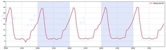 Unfortunately, the ANPR data inevitably suffer from the missing data problem in the process of data collection [11], which goes against sustainable development. Due to detection failure and device malfunction, we might see traffic data missing in certain spaces and times, which is ubiquitous in other systems and has been addressed by much research [12,13,14,15]. For individual level data, the missing case can be the loss of vehicle identities of certain records because of number plate recognition failure, which might influence the performance and reliability of individual travel data. Table 1 shows several anonymous records from an ANPR database, in which there is one without an identification label. Besides, for the reason of different illuminations, resolutions and flow volumes, the missing rates vary along different times of day, as illustrated in Figure 1. In this work, we aim at inferring the missing vehicle identities accurately given the raw ANPR records from a road network.