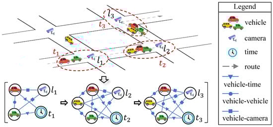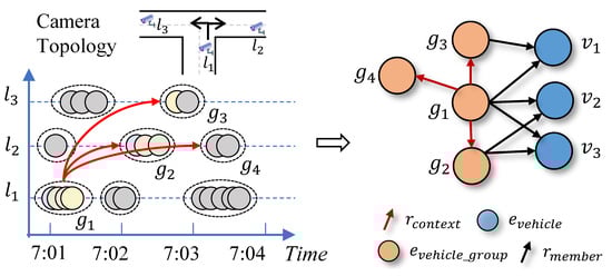 With this in mind, context links are introduced among vehicle group entities to model the relationships between detected records spatially and temporally. As the vehicle group entities already hold both space and time information, the context connections between them are spatiotemporal relations. Specifically, for vehicle group entities and , we extract a spatiotemporal relation between them if they satisfy the following two conditions: (1) without loss of generality, the camera site of is located at the downstream intersection of (i.e., the camera location of ); (2) the beginning time of has a time-delay (but within the limits of a threshold) after of according to the road segment between and . Figure 6 gives an illustration of how spatiotemporal context links extract. After this process, the connection structure of certain entities have renewed which corresponds to the partial graph on the right.