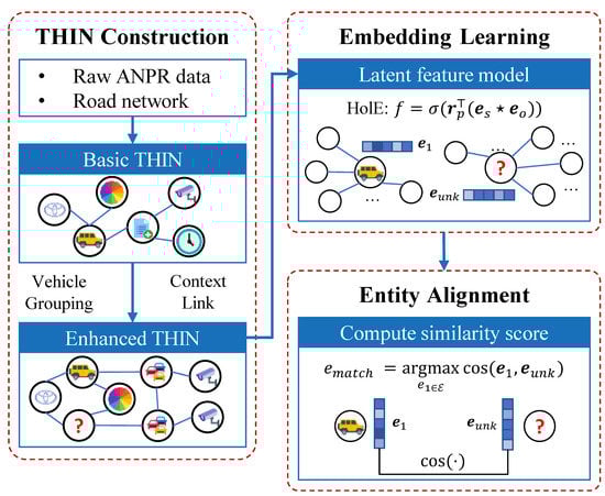 Our framework first requires the construction of a THIN, in which entities and relations are all defined elements. Intuitively, an ANPR record corresponds to a passing event entity, and then the vehicle and camera location entities can be further derived from it. For vehicle attributes, we directly treat them as property entities. With this basic THIN, we further apply vehicle grouping and context link extraction in order to model the companion interactions of vehicles and capture the semantic proximities among entities. Then we implement the latent feature based representation learning algorithms on the enhanced THIN to embed the entity features into the low dimensional space and produce a dense embedding vector for each entity e. Once we obtain the embeddings for all entities, the entity alignment unit finds every pair with a proper similarity score where entities and belong to the same type . whose identity is unknown is the entity extracted from an incomplete record.