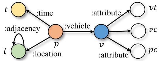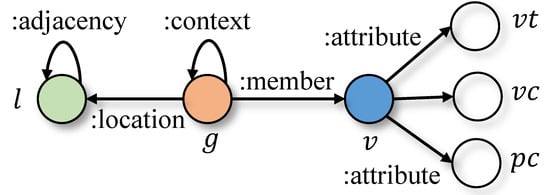 Next, we detail all kinds of edges in our enhanced THIN. First, for vehicles and their appearance properties, there are three attribute relationships, namely vehicle–vehicle color edges, vehicle–vehicle type edges and vehicle–plate color edges. Then with regard to the relationships between the object entities, we treat vehicle group entities as central entities and their edges to other entities can be easily derived in accordance with the traveling semantic. As a result, we have location relations between vehicle group and camera location, member relations between vehicle group and vehicle and context relations between vehicle group themselves. Finally, the adjacency relationships are reserved between camera location entities adhering to the topology of the road network. The updated graph schema is illustrated in Figure 7.