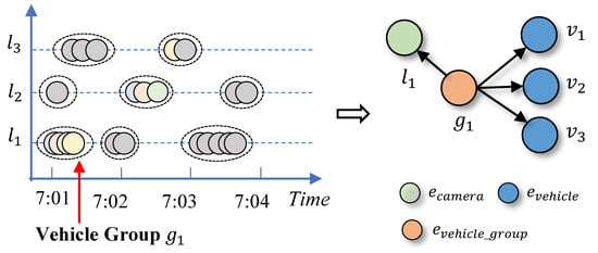 Based on the ideas above, we conduct vehicle grouping process to create a new type of entity. As defined in Section 3.1, for each location l of camera sites in time period , we replace the passing event entities, which is linked to l and t between with a single vehicle group entity g. Figure 5 illustrates the operation of vehicle grouping, where circles and ovals with dash border on the left are passing events of vehicles and vehicle group entities respectively. After that, entity g is connected to l and the relevant vehicle entities on the right of Figure 5.