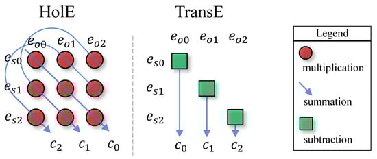 Figure 8 shows the element-wise interactions among the embeddings. For TransE, the latent features of entities are combined (i.e., linear summation or subtraction) independently. In contrast, HolE explicitly models all relationships between the latent features of different entities via circular correlation which allows to capture the complex interaction between subject and object with the multiplicative forms. As a result, the modeling power of HolE is naturally more expressive.
