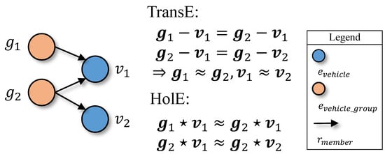 Moreover, different from quantifying the similarities with the circular correlation results in HolE, the predicate in (5) is modeled as the transition vectors between subject and object, which brings restrictions to the distributions of entities and relations in the vector space. As illustrated in Figure 9, we will get the same embeddings for vehicle group entities as well as vehicle entities (i.e., and ) since TransE can not deal with the one-to-many and many-to-one member relation in the enhanced THIN. These embeddings ignore the difference among entities and thus contradict the truth. Considering the flexibility of circular correlation as well as the complex relation structure of the enhanced THIN, we adopt HolE to the embedding learning problem.