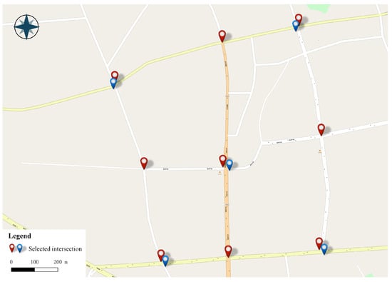We use the real world ANPR data obtained from Xuancheng, China, which has wide coverage of high-definition cameras deployed at signalized intersections. The ANPR system data are anonymized and the usage of them is authorized by the Public Security Bureau of Xuancheng. To efficiently evaluate different models, we choose a specific area shown in Figure 10 where 9 intersections (red markers) are selected and a time period from 7:00 a.m. to 11:00 a.m. on 7 August 2018. The study area is located at the center of the city and each intersection is equipped with cameras in different directions (i.e., 35 cameras in total). The average distance between the adjacent intersections is about 500 m, making it clear to identify the spatiotemporal context.